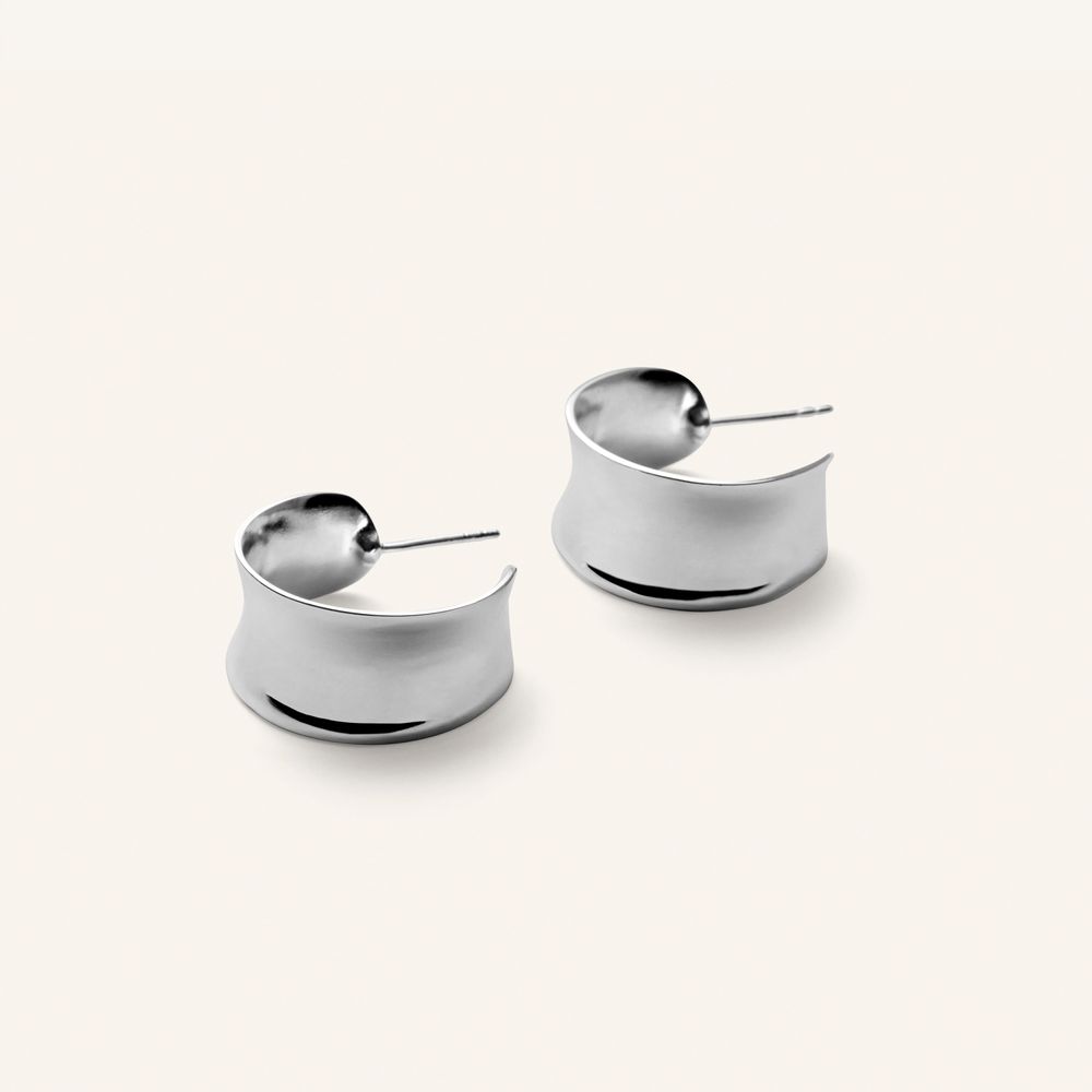Large Reflection Hoops er et sæt smukke, brede statement-hoops. Øreringene er designet med inspiration fra det klare vinterlys og den måde, det reflekteres på blanke overflader – sne og is.