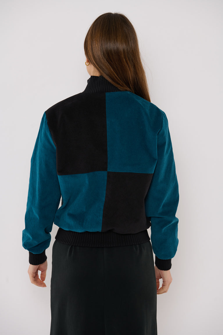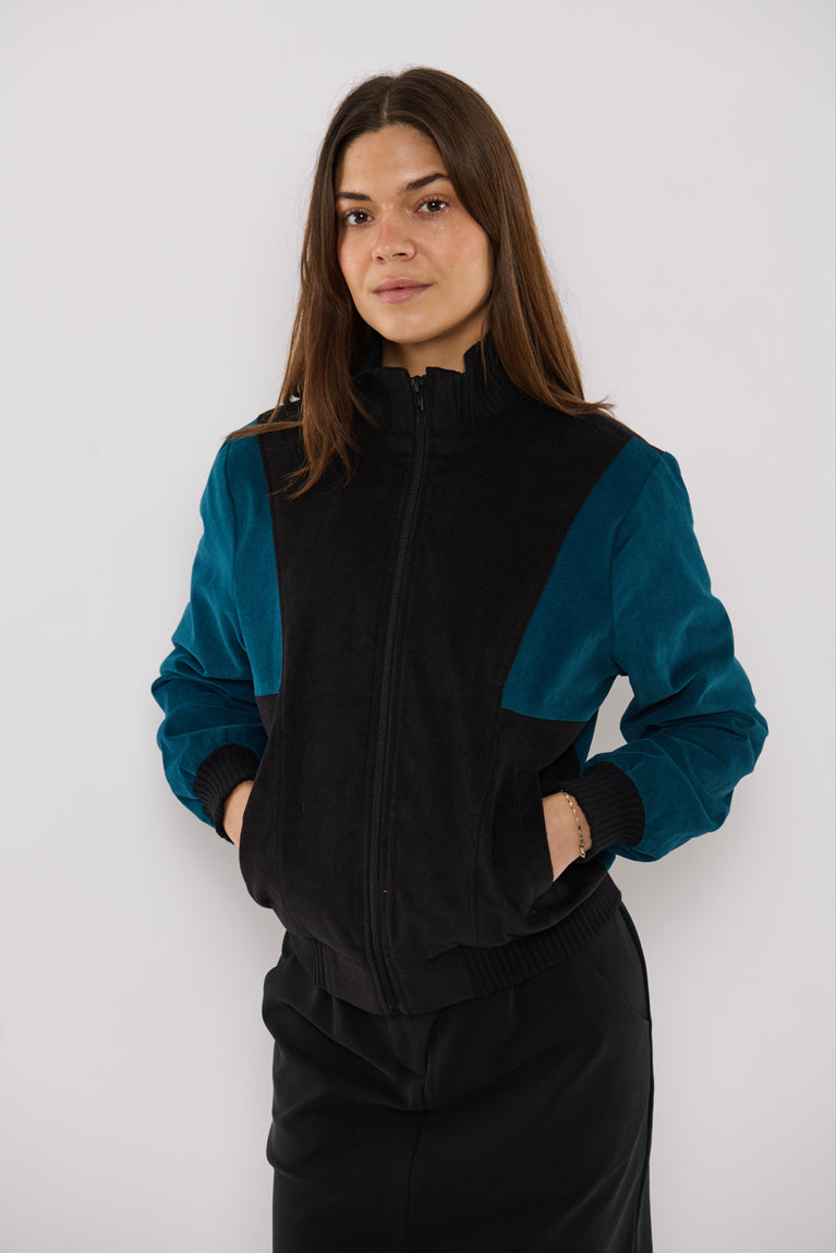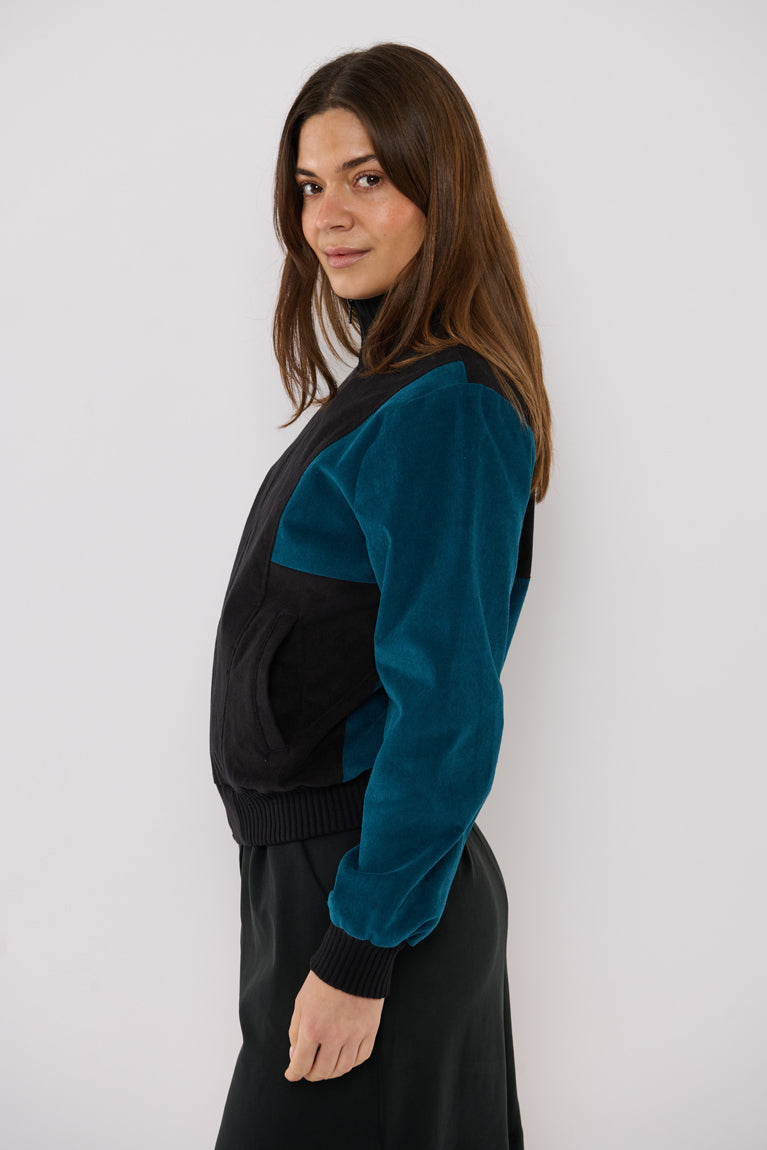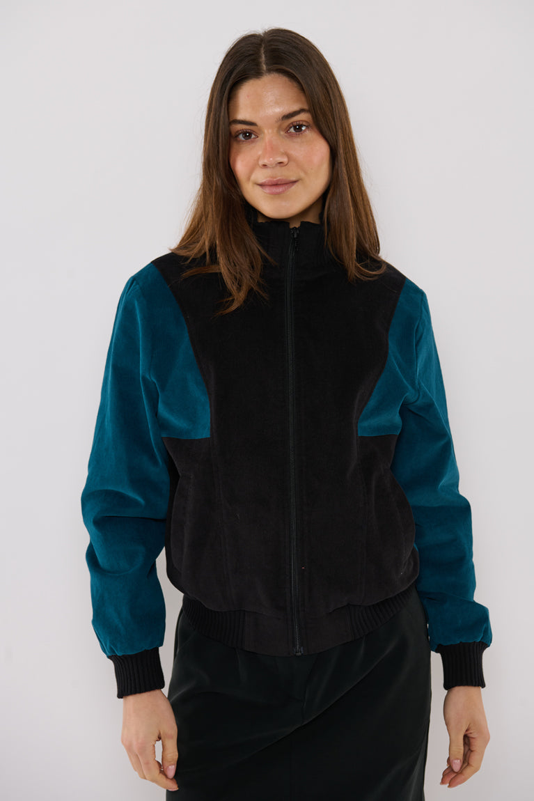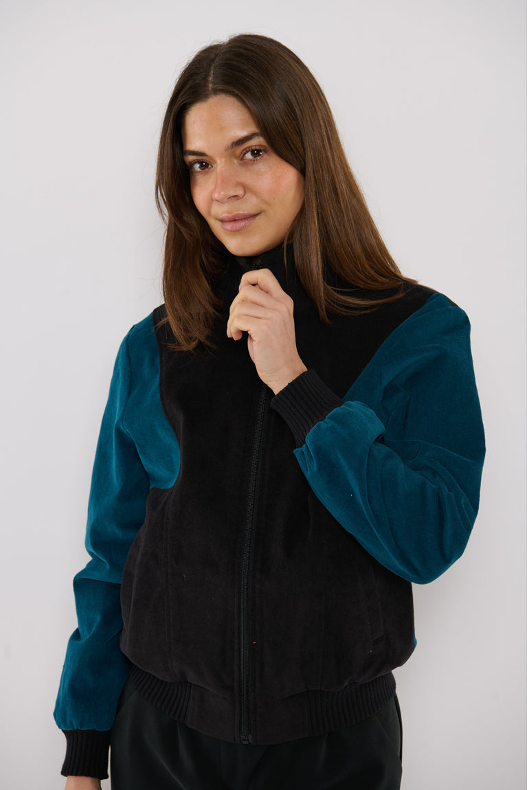 Bomberjakke i blød, fint-rillet fløjl i sort og petrol