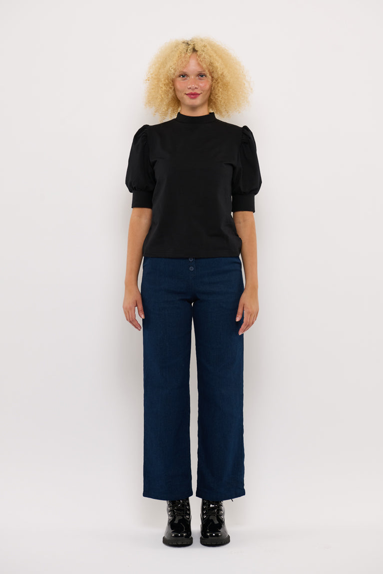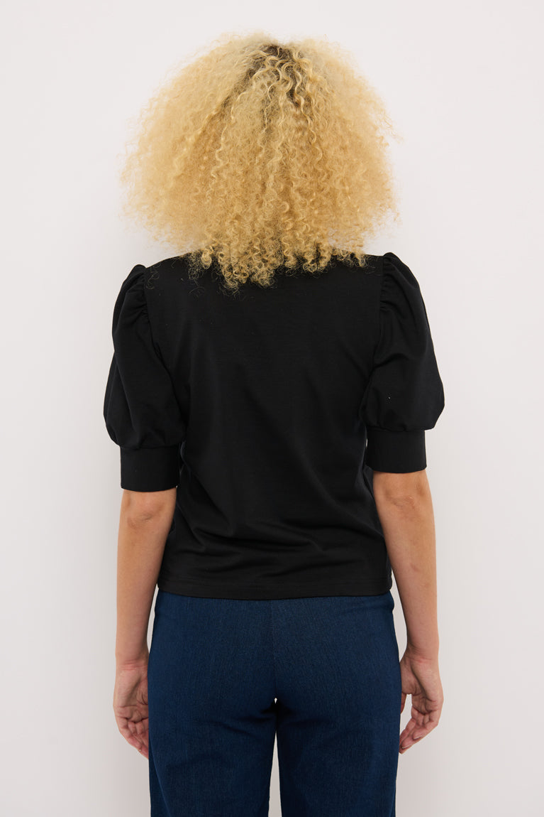 Magda-blusen i sort er en stilren T-shirt-bluse i blød french terry bomuldsblanding. De voluminøse pufærmer tilfører et feminint og moderne twist, mens den sorte farve giver et mere klassisk udtryk. En bluse med både komfort og karakter.Magda-blusen findes i flere farver og materialer – se hele udvalget HER