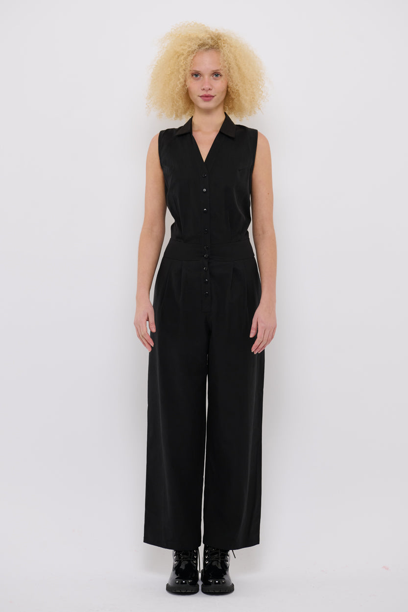 En klassisk og stilren ærmeløs buksedragt i sort, designet med et markeret taljestykke, vide bukseben, sidelommer og fine knapper foran. Silhuetten er tidløs, feminin og samtidig moderne i udtrykket.
