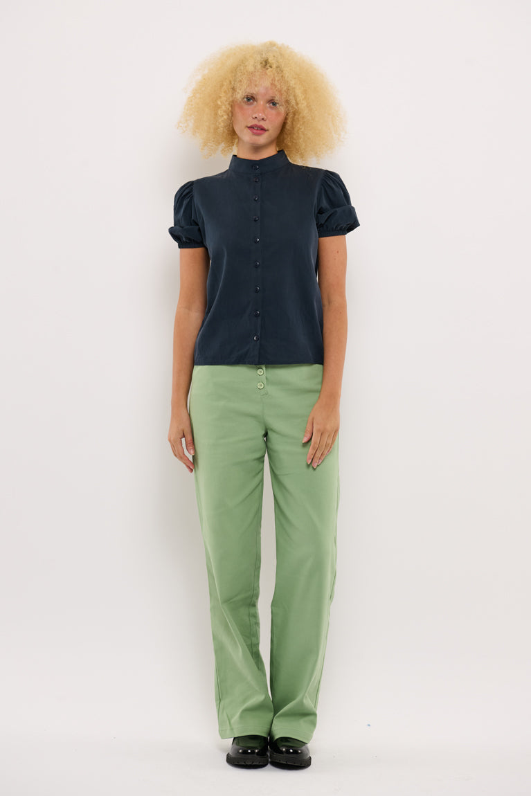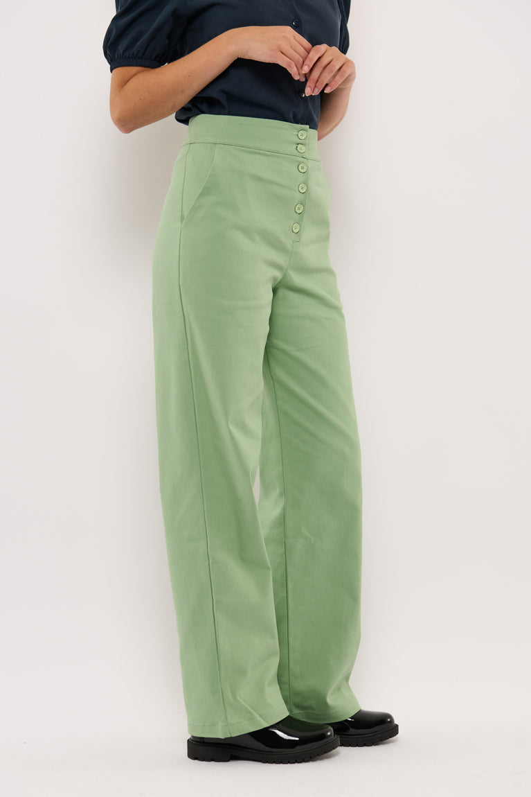 Stilfulde Sophia Lee Wilde bukser i limegrøn med højtaljet pasform og vide ben. Strækbart materiale, der sikrer både komfort og et moderne look. Perfekte til både hverdag og fest.