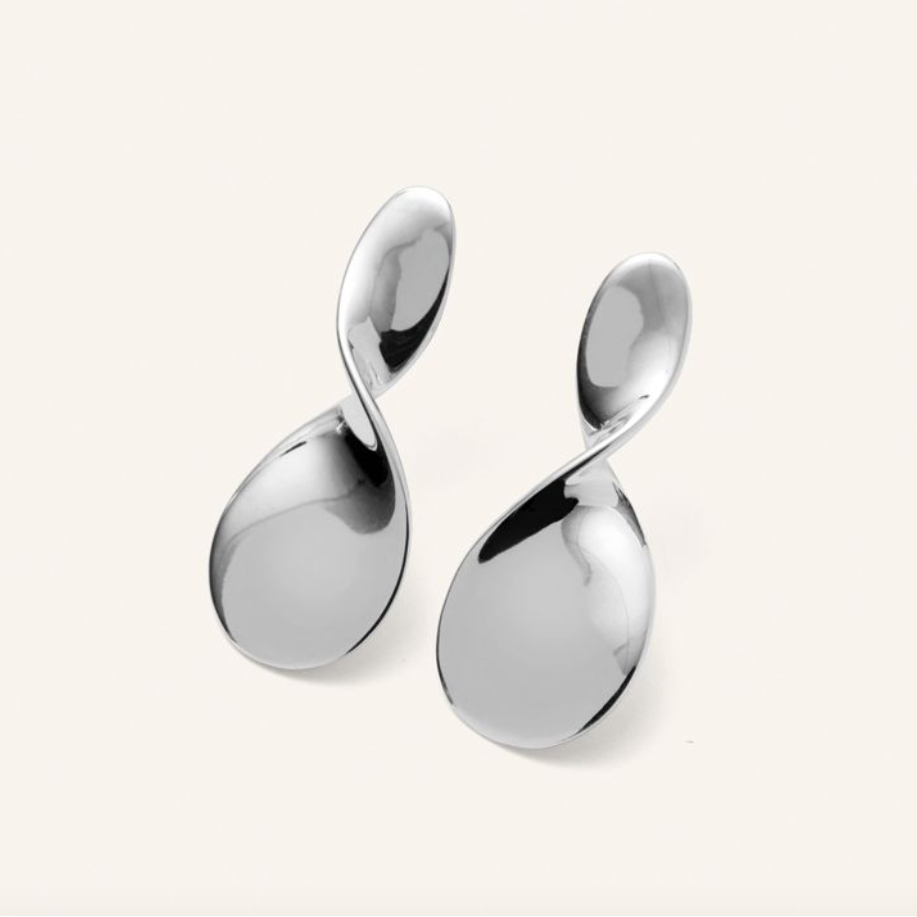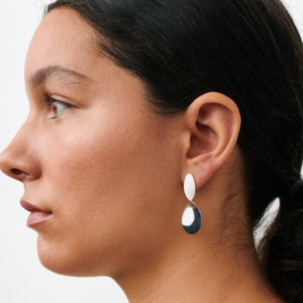 Small La Pausa Earring fra Pernille Corydon, er en fin skulpturel ørestik, med et blødt twist i midten – som et lille symbol på bevægelse, frihed og kreativ energi. Formen er enkel og elegant, men samtidig legesyg og levende, og den spejlblanke overflade fanger lyset i hver bevægelse.