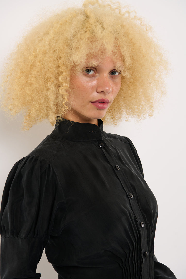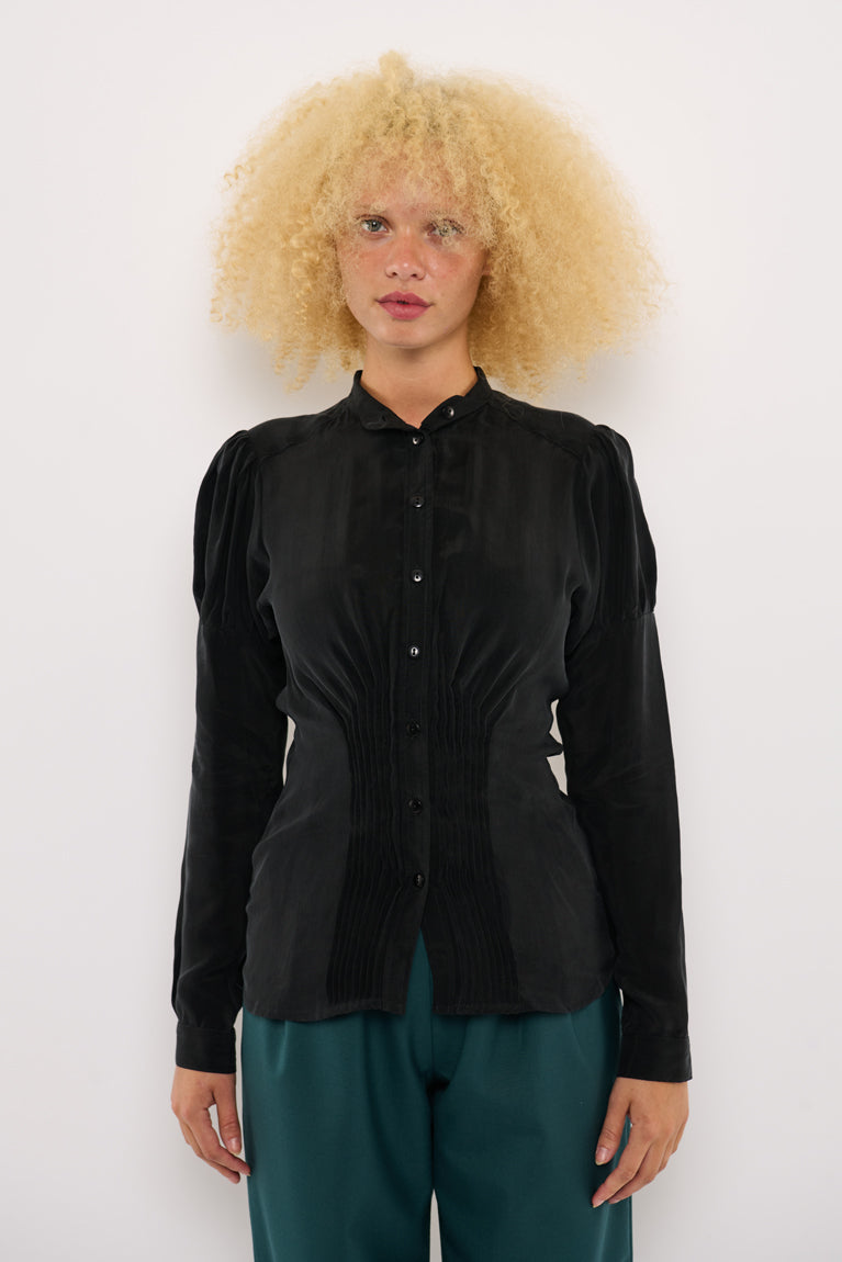 Skjorten har lange ærmer med puf ved skuldrene og fine læg foran, som fremhæver den elegante pasform. Knaplukningen foran tilføjer et klassisk udtryk, og det feminine snit gør den raffineret og stilfuldt