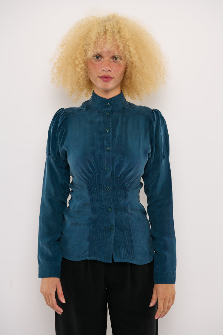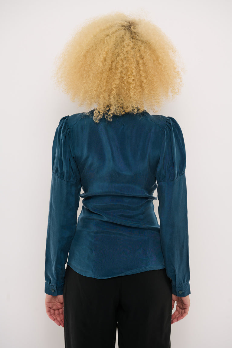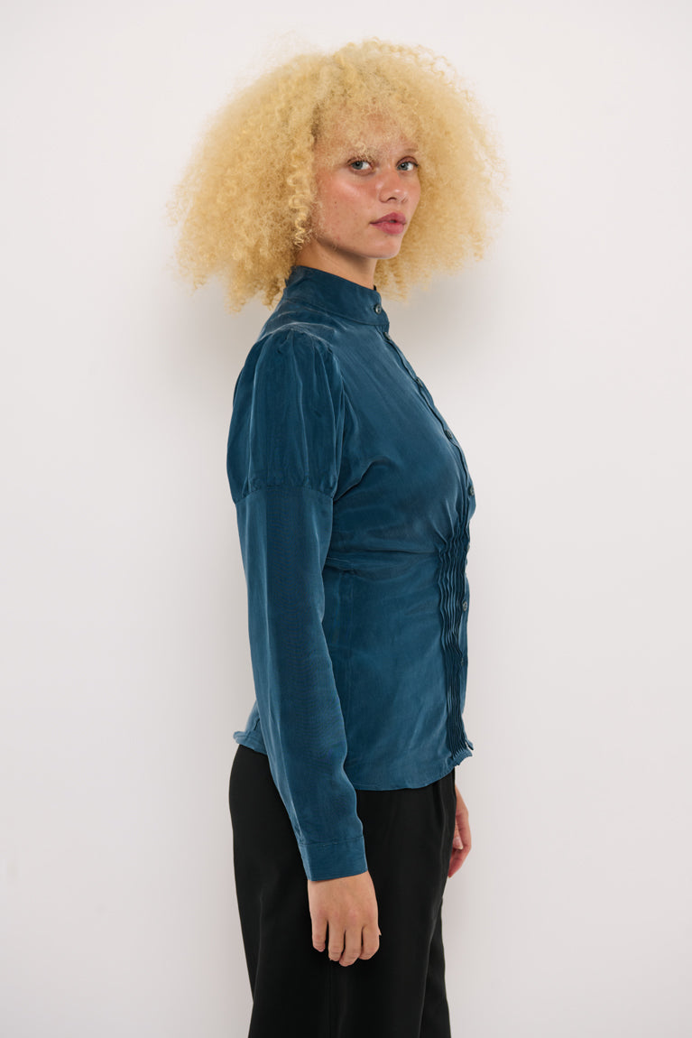 Skjorten har lange ærmer med puf ved skuldrene og fine læg foran, som fremhæver den elegante pasform. Knaplukningen foran tilføjer et klassisk udtryk, og det feminine snit gør den raffineret og stilfuldt