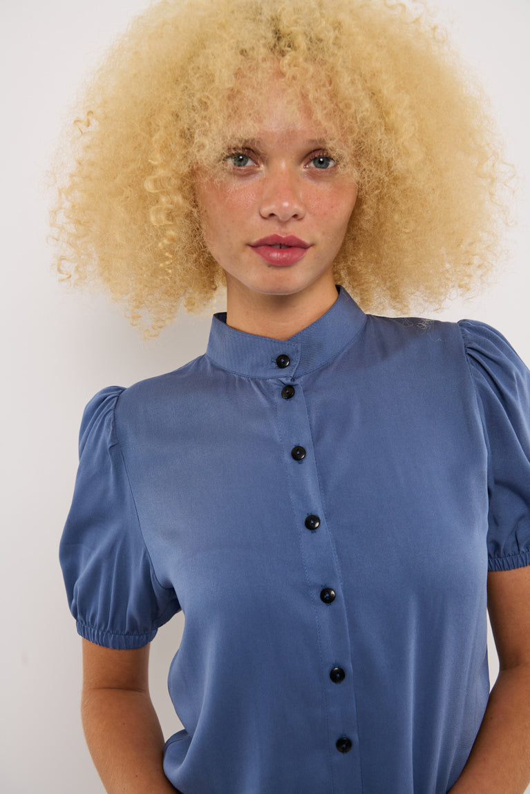 En smuk og feminin skjorte med store korte pufærmer med elastik, der giver et let og voluminøst udtryk. Skjorten har knapper foran og en afrundet kant, der gør den lidt længere bagpå.