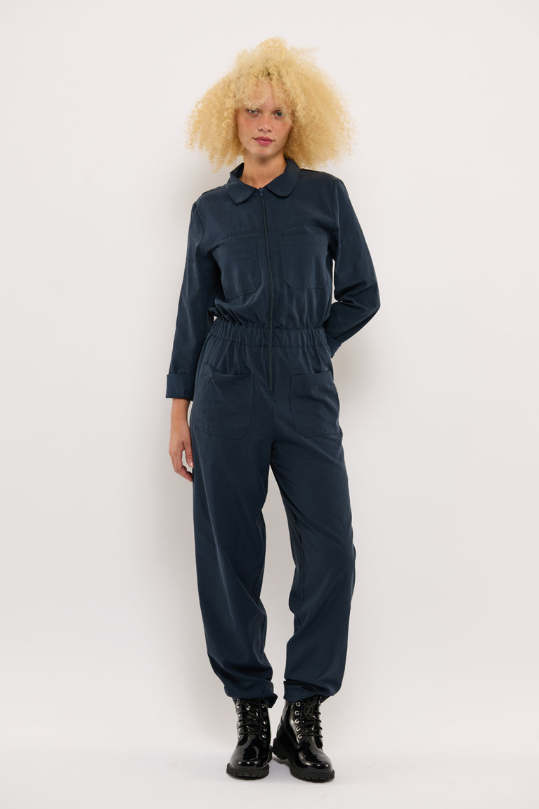 Buksedragt i en flot mørkeblå farve, designet med elastik i taljen, påsyet lommer og lynlås fortil. Inspireret af en gammel arbejdskedeldragt, men med et lidt mere flatterende udseende, og en mere tætsiddende pasform.