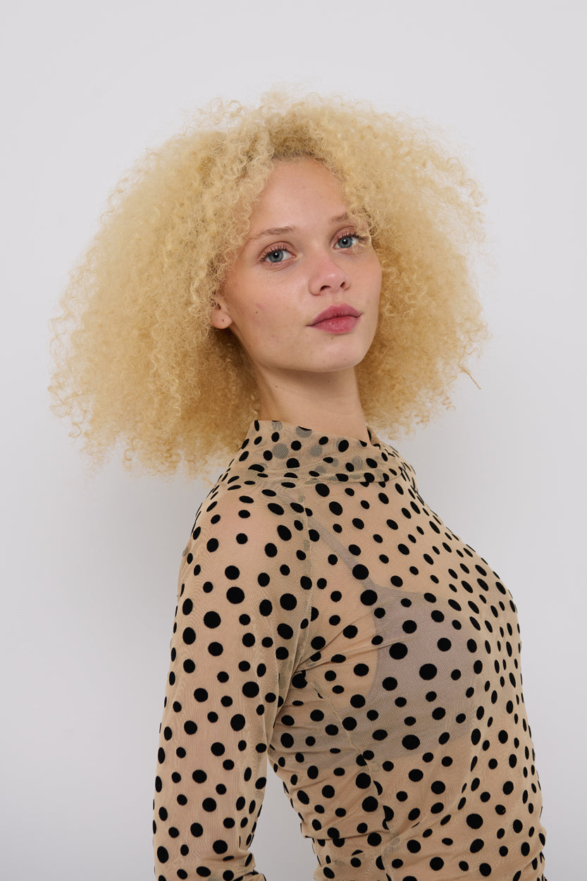 En stilren og iøjnefaldende bluse i et let, gennemsigtigt materiale med smukke sorte velourprikker.