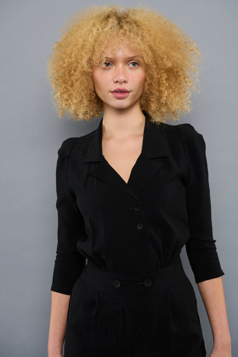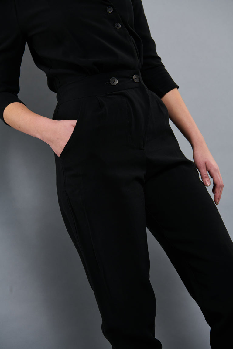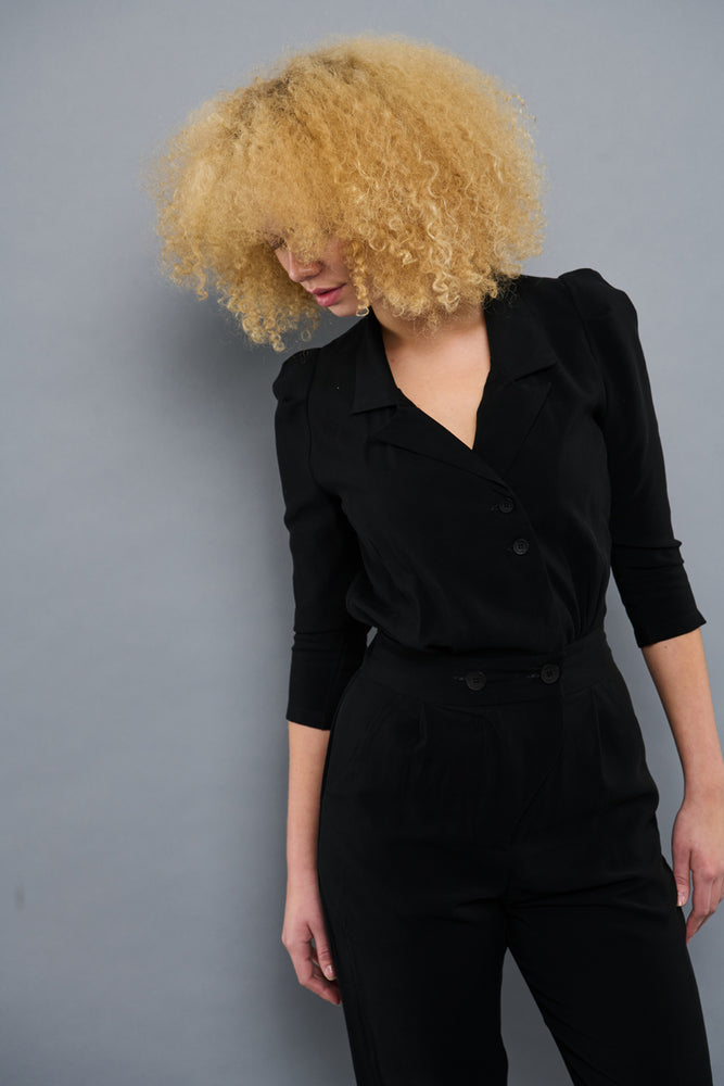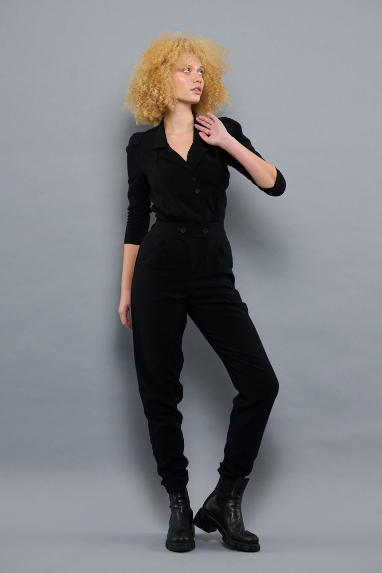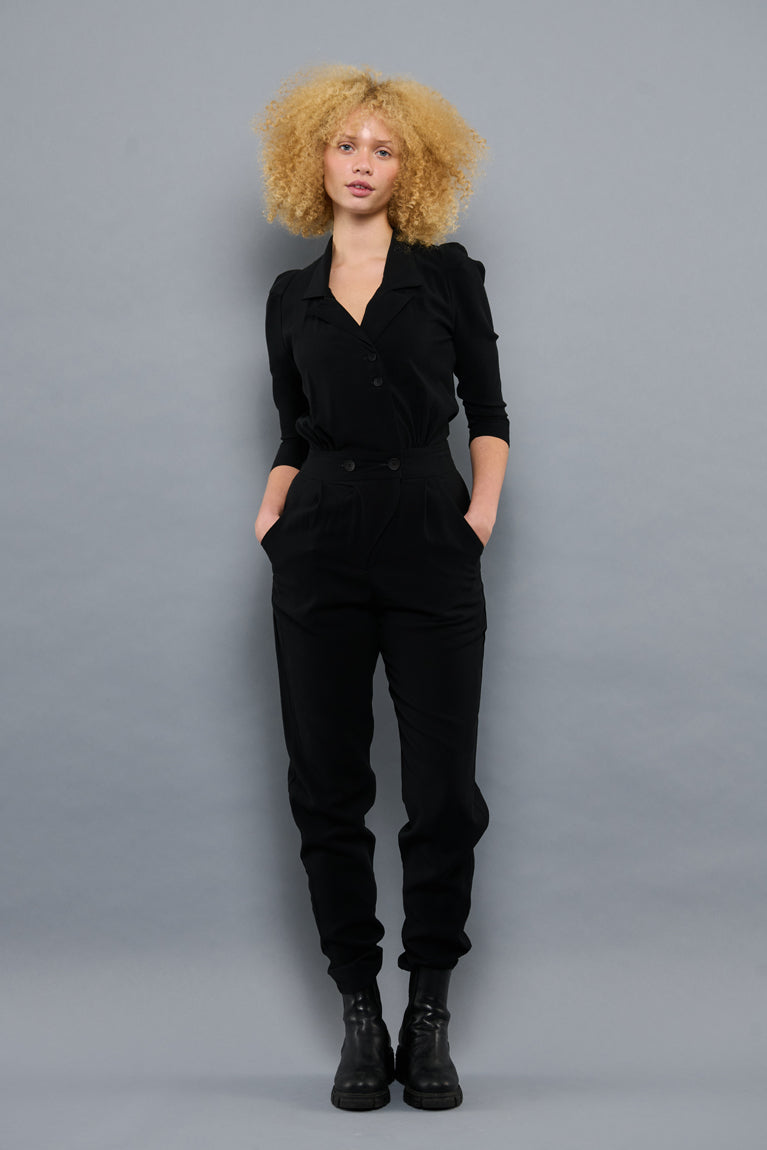 Flot klassisk buksedragt i sort, designet med elastik bagved i taljen og to store knapper fortil i taljen, giver et flot fit og fremhæver figuren. Dragten har sidelommer, en fin reverskrave og to mindre knapper fortil.
