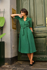 Elegant buksedragt i en flot petroleum farve, designet med en markeret talje, vide bukseben, sidelommer og fine knapper foran.